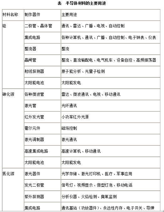 在半导体产业的发展中,一般将硅、锗称为第一代半导体材料;将砷化镓、磷化锢、磷化镓、砷化锢、砷化铝及其合金等称为第二代半导体材料;而将宽禁带(Eg>2.3eV)的氮化镓、碳化硅、硒化锌和金刚石等称为第三代半导体材料。上述材料是目前主要应用的半导体材料, 三代半导体材料代表品种分别为硅、砷化镓和氮化镓。表中禁带宽度决定发射光的波长,禁带宽度越大发射光波长越短(蓝光发射);禁带宽度越小发射光波长越长。其它参数数值越高, 半导体性能越好。电子迁移速率决定半导体低压条件下的高频工作性能,饱和速率决定半导 体高压条件下的高频工作性能。 硅材料具有储量丰富、价格低廉、热性能与机械性能优良、易于生长大尺寸高纯度晶体等优点,处在成熟的发展阶段。 目前,硅材料仍是电子信息产业最主要的基础材料,95%以上的半导体器件和99%以上的集成电路(IC)是用硅材料制作的。在21世纪,它的主导和核心地位仍不会动摇。但是硅材料的物理性质限制了其在光电子和高频高功率器件上的应用。 砷化镓材料的电子迁移率是硅的6倍多,其器件具有硅器件所不具有的高频、高速和光电性能,并可在同一芯片同时处理光电信号,被公认是新一代的通信用材料。随着高速信息产业的蓬勃发展,砷化镓成为继硅之后发展最快、应用最广、产量最大的半导体材料。同时,其在军事电子系统中的应用日益广泛,并占据不可取代的重要地位。 选择宽带隙半导体材料的主要理由是显而易见的。氮化镓的热导率明显高于常规半导体。 这一属性在高功率放大器和激光器中是很起作用的。带隙大小本身是热生率的主要贡献者。在任意给定的温度下,宽带隙材料的热生率比常规半导体的小10~14个数量级。这一特性在电荷耦合器件、新型非易失性高速存储器中起很大的作用,并能实质性地减小光探测器的暗电流。宽带隙半导体材料的高介电强度最适合用于高功率放大器、开关和二极管。 宽带隙材料的相对介电常数比常规材料的要小,由于对寄生参数影响小,这对毫米波放大器而言是有利用价值的。电荷载流子输运特性是许多器件尤其是工作频率为微波、毫米波放大器的一个重要特性。宽带隙半导体材料的电子迁移率一般没有多数通用半导体的高,其空穴迁移率一般较高,金刚石则很高。宽带隙材料的高电场电子速度(饱和速度)一般较常规半导体高得多,这就使得宽带隙材料成为毫米波放大器的首选者。 氮化镓材料的禁带宽度为硅材料的3倍多,其器件在大功率、高温、高频、高速和光电子应用方面具有远比硅器件和砷化镓器件更为优良的特性,可制成蓝绿光、紫外光的发光器件和探测器件。近年来取得了很大进展,并开始进入市场。与制造技术非常成熟和制造成本相对较低的硅半导体材料相比, 第三代半导体材料目前面临的最主要挑战是发展适合氮化镓薄膜生长的低成本衬底材料和大尺寸的氮化镓体单晶生长工艺。 主要半导体材料的用途如下表所示。可以预见:以硅材料为主体、GaAs半导体材料及新一代宽禁带半导体材料共同发展将成为集成电路及半导体器件产业发展的主流。